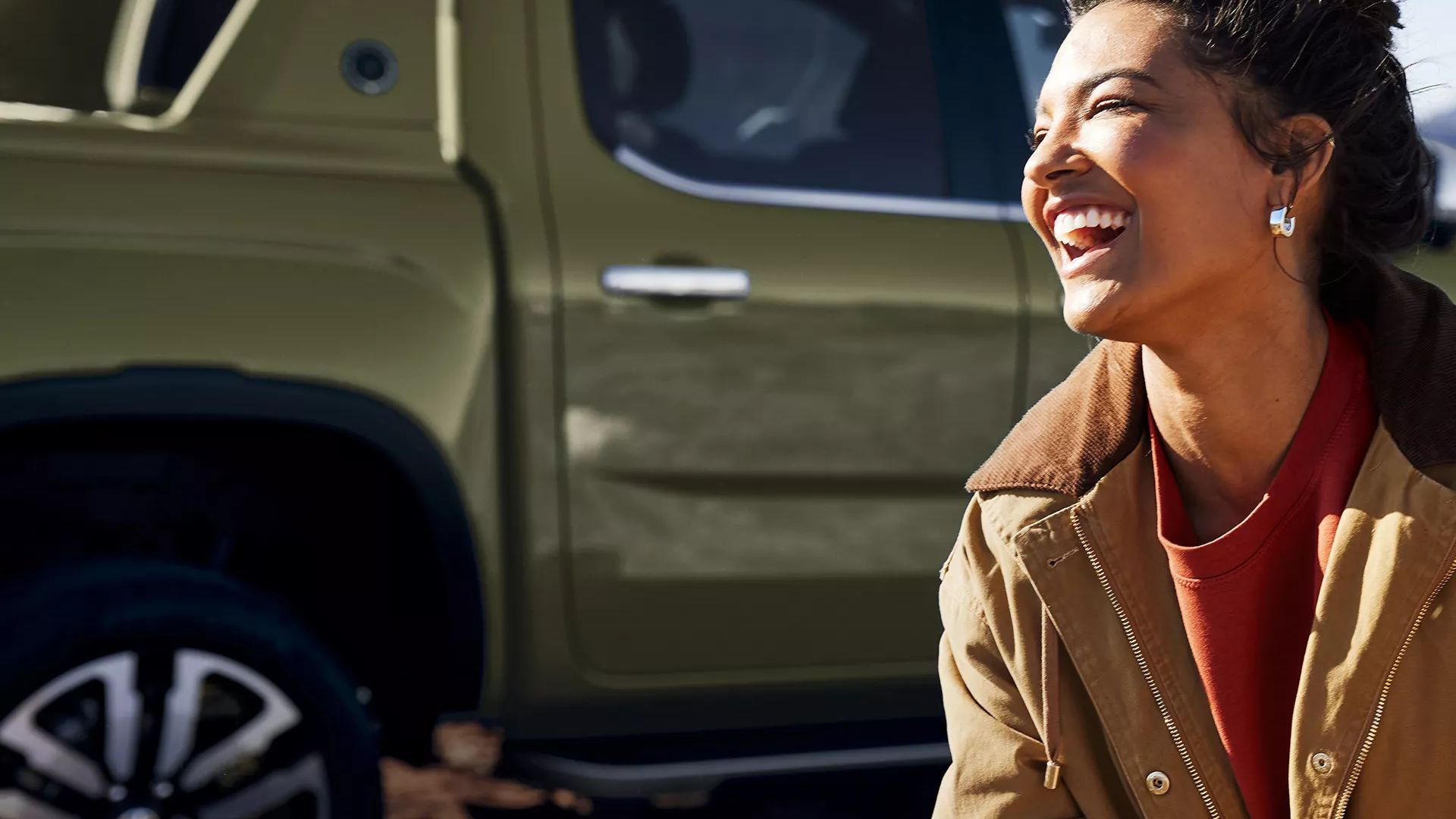 Zwei Kinder sitzen auf der heruntergeklappten Ladefläche eines olivgrünen Pickup-Trucks und benutzen ein Tablet. Die Ladefläche des Fahrzeugs ist leer und mit einer schwarzen Matte ausgekleidet. Die Szene findet draußen statt, bei natürlichem Licht.