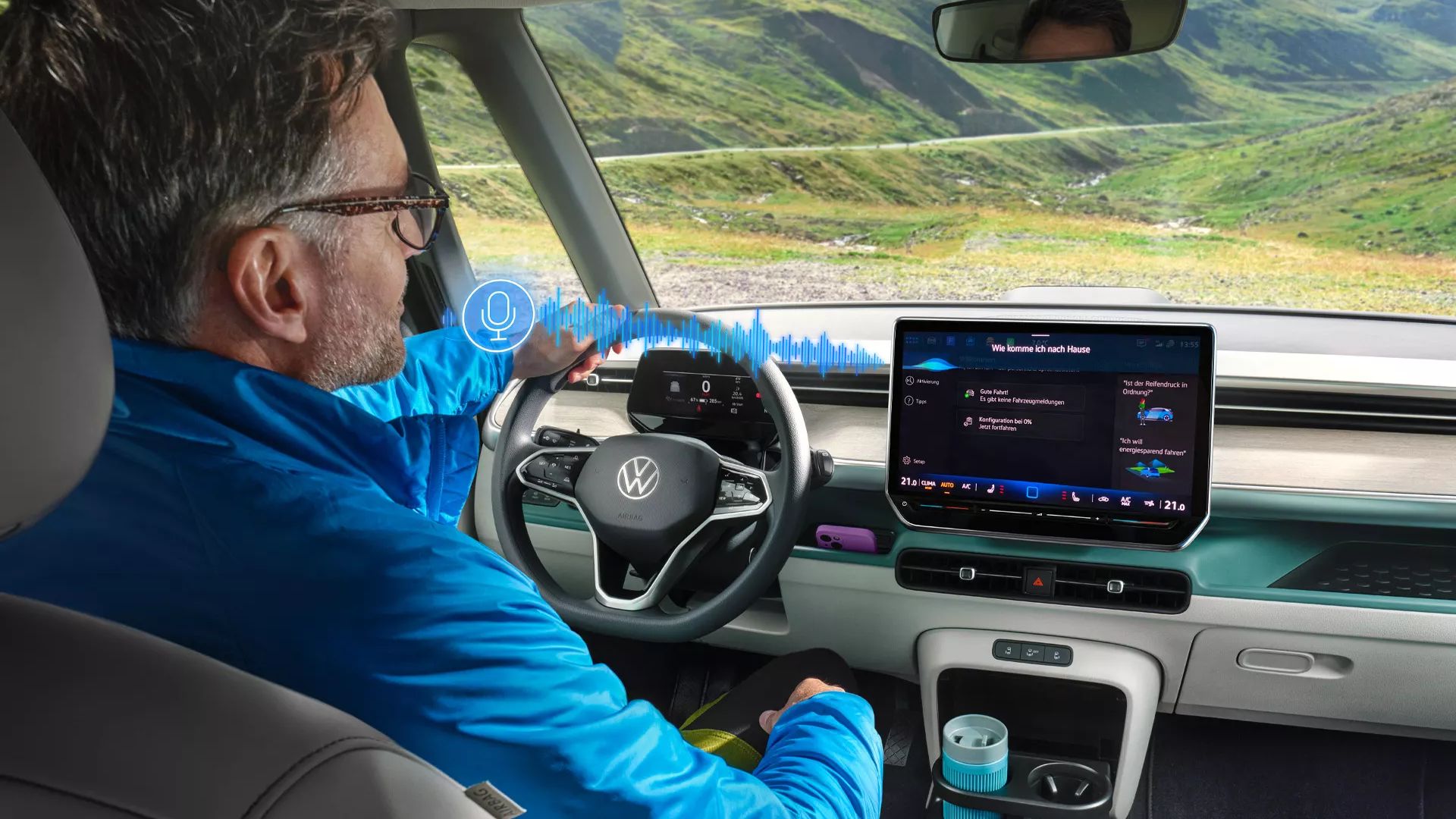 Für alle, die gern mit Ihrem Auto sprechen: Ihr ID. Buzz hört Ihnen zu. Mit dem Sprachassistenten⁠⁠1 können Sie schnell und ganz komfortabel eine Vielzahl an Infotainment- und Fahrzeugfunktionen steuern. Bedienen Sie zum Beispiel Radio oder Telefon einfach per Sprachbefehl – und halten Sie dabei die Straße immer sicher im Blick.